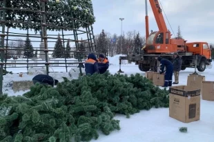 Сотрудники МБУ «Городской центр по благоустройству и озеленению» разбирают металлический каркас и снимают декоративные еловые ветки.