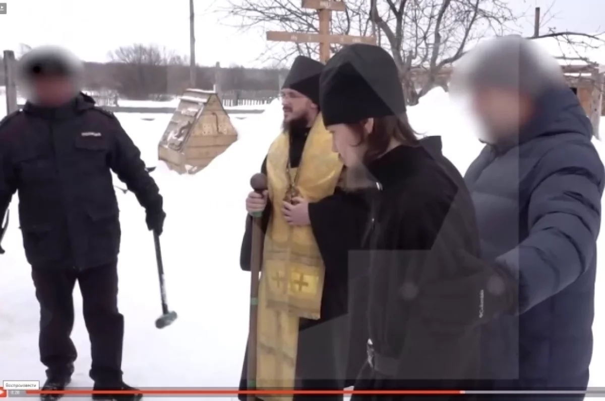 На кадрах видно, как представители правоохранительных органов вскрывают дверь в здание, после чего выводят на улицу несколько человек в чёрных рясах.